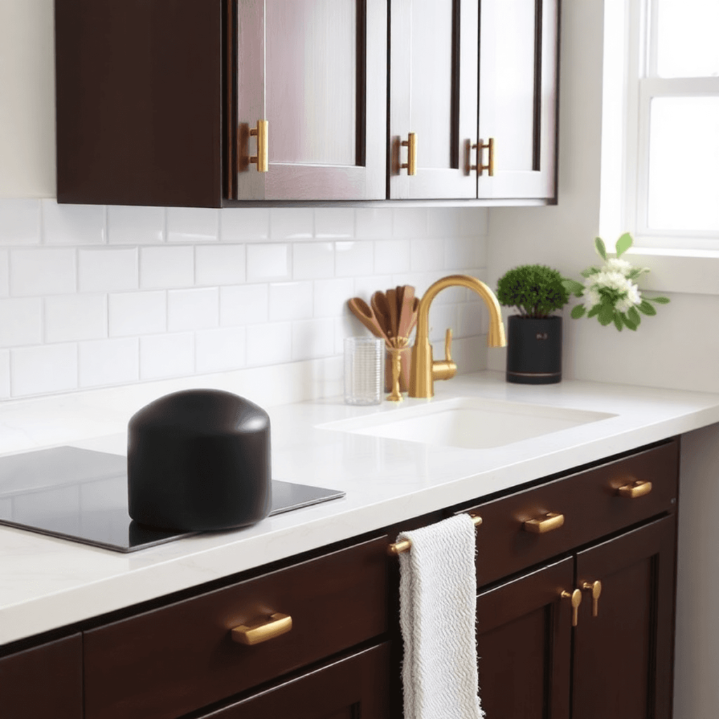 - Replace knobs, pulls, and faucets with brass, matte black, or brushed gold.